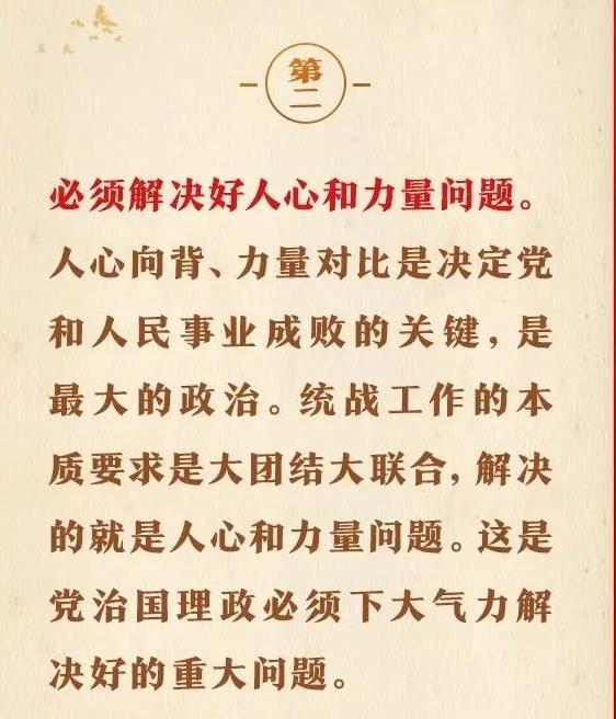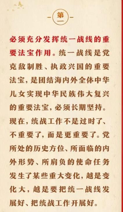 1月16日出版的第2期《求是》雜志刊發(fā)習(xí)近平總書記重要文章《完整、準(zhǔn)確、全面貫徹落實(shí)關(guān)于做好新時代黨的統(tǒng)一戰(zhàn)線工作的重要思想》。在這篇重要文章中,習(xí)近平總書記充分肯定我們黨百年統(tǒng)戰(zhàn)的歷史性貢獻(xiàn)和新時代統(tǒng)戰(zhàn)工作取得的歷史性成就,用“十二個必須”對關(guān)于做好新時代黨的統(tǒng)一戰(zhàn)線工作的重要思想作出概括,強(qiáng)調(diào)關(guān)于做好新時代黨的統(tǒng)一戰(zhàn)線工作的重要思想,是黨的統(tǒng)一戰(zhàn)線百年發(fā)展史的智慧結(jié)晶,是新時代統(tǒng)戰(zhàn)工作的根本指針,全黨必須完整、準(zhǔn)確、全面貫徹落實(shí)。